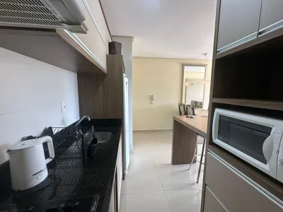 Excelente apartamento mobiliado e equipado a 350 metros do mar. Composto por 01 dormitório, salas de estar e jantar integradas, cozinha, banheiro social, lavanderia e box para 01 veículo. Todo mobilado com móveis sob medida... Eletrodomésticos todos novos, máquina de lavar, ar condicionado, forno elétrico , geladeira, fogão de bancada, ventilador grande de chão. Prédio com elevador e salão de festas.