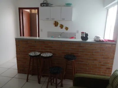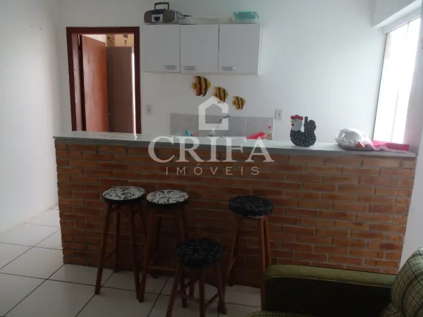 Apartamento mobiliado localizado em Bal. Jardim Atlântico composto por 01 dormitório, conceito aberto integrando sala de estar e cozinha estilo americana com bancada, banheiro social e lavanderia.