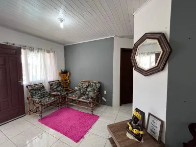 Composta por 03 dormitórios sendo 01 suíte, sala de estar com lareira, cozinha ampla sob medida com churrasqueira integrada à sala de jantar, banheiro social, pátio nos fundos com área de serviço, além de abrigo para 02 veículos.